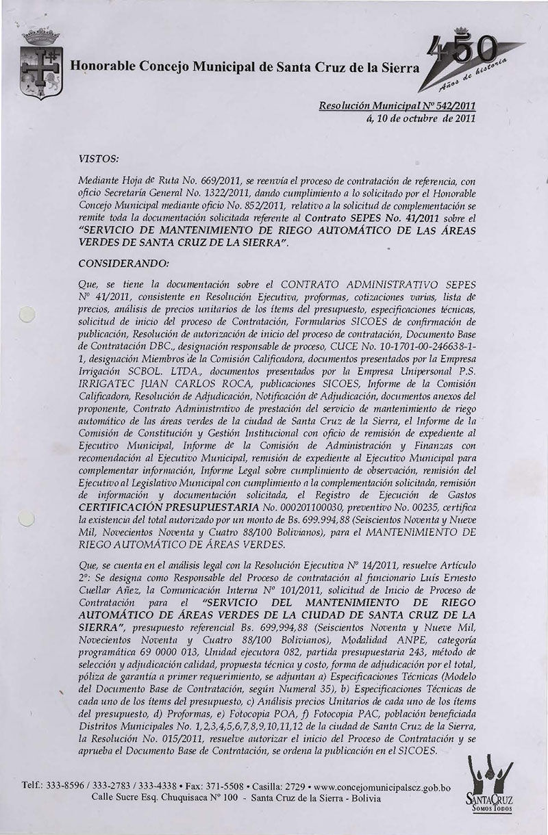 Aprueba el CONTRATO ADMINISTRATIVO SEPES Nº 41/2011, relativo a la “PRESTACIÓN DEL SERVICIO DE MANTENIMIENTO DE RIEGO AUTOMÁTICO DE LAS ÁREAS VERDES DE LA CIUDAD, por el monto de Bs. 635.800,83.