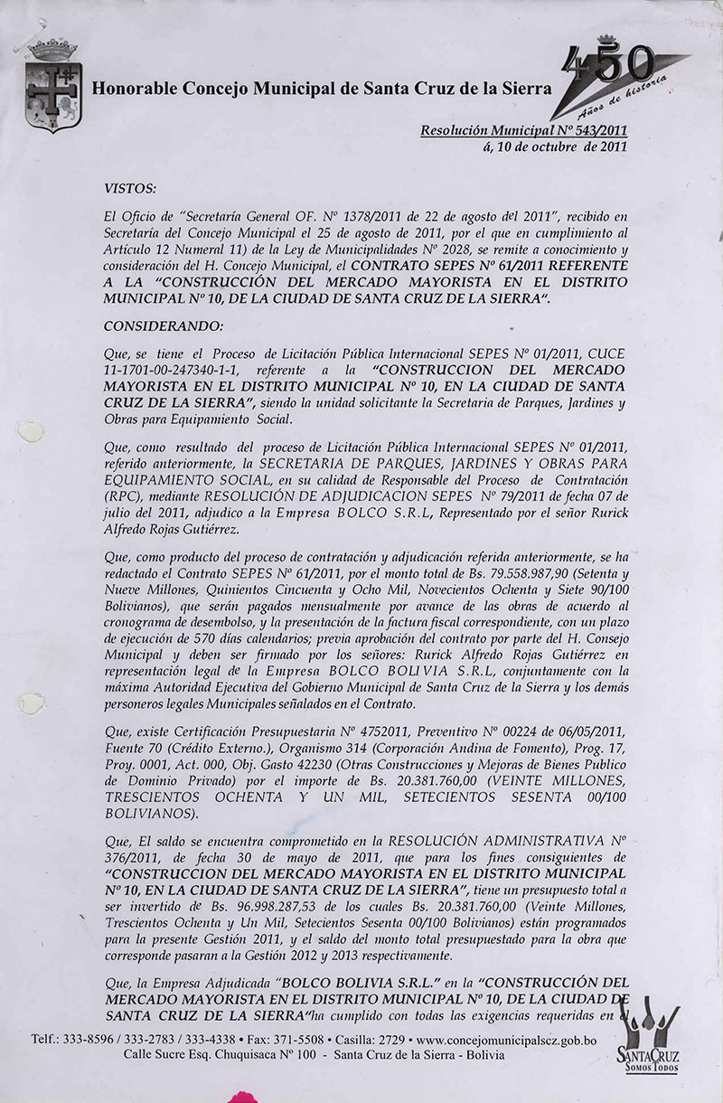Aprueba el CONTRATO SEPES Nº 61/2011, para la “CONSTRUCCIÓN DEL MERCADO MAYORISTA EN EL DISTRITO MUNICIPAL Nº 10, por el monto de Bs. 79.558.987,90., adjudicado a la Empresa BOLCO.