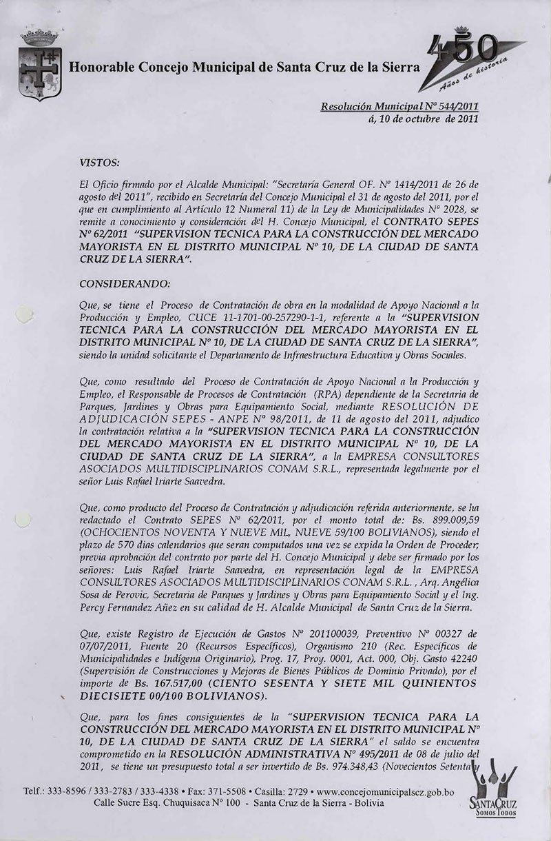 Aprueba el CONTRATO SEPES Nº 62/2011, para el “ SERVICIO DE SUPERVISION TECNICA PARA LA CONSTRUCCIÓN DEL MERCADO MAYORISTA EN EL DISTRITO MUNICIPAL Nº 10, por el monto de Bs. 899.009,59., adjudicado a la Empresa CONAM SRL.