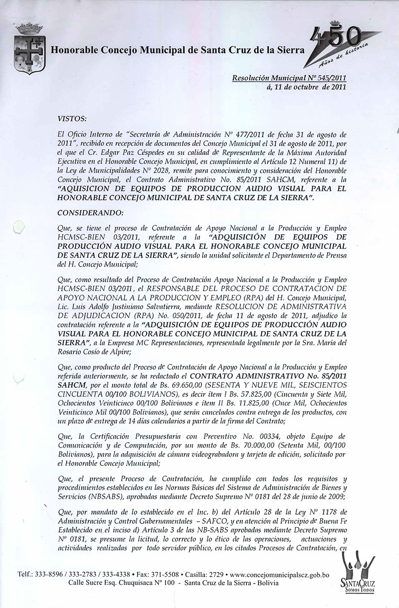 Aprueba el Contrato Administrativo No. 85/2011, referente SAHCM referente a la “AQUISICION DE EQUIPOS DE PRODUCCION AUDIO VISUAL PARA EL CONCEJO MUNICIPAL DE SANTA CRUZ DE LA SIERRA.