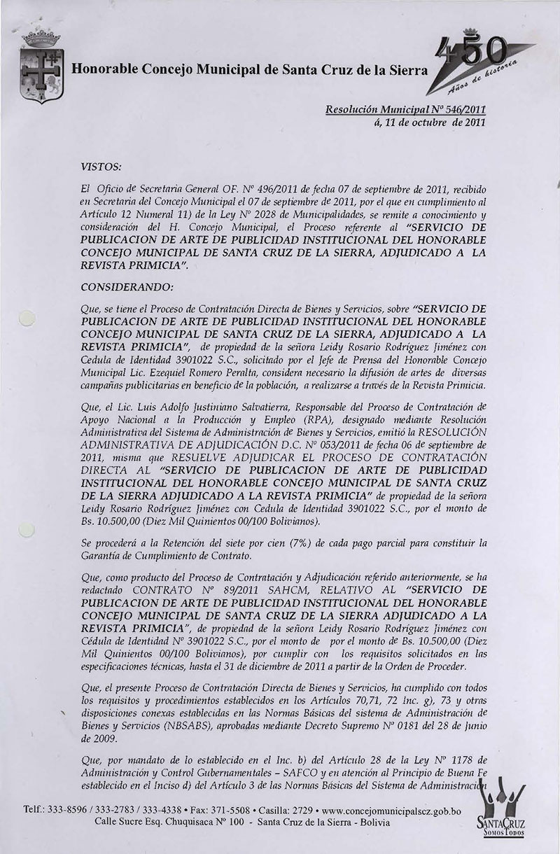 Aprueba el CONTRATO ADMINISTRATIVO Nº 89/2011 SAHM referente a “SERVICIO DE PUBLICACIÓN DE ARTE DE PUBLICIDAD INSTITUCIONAL DEL CONCEJO MUNICIPAL DE SANTA CRUZ DE LA SIERRA".