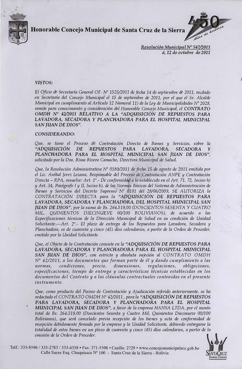 Aprueba el CONTRATO OMDH Nº 42/2011, para el “SERVICIO DE ADQUISICIÓN DE REPUESTOS PARA LAVADORA, SECADORA Y PLANCHADORA PARA EL HOSPITAL MUNICIPAL SAN JUAN DE DIOS”.