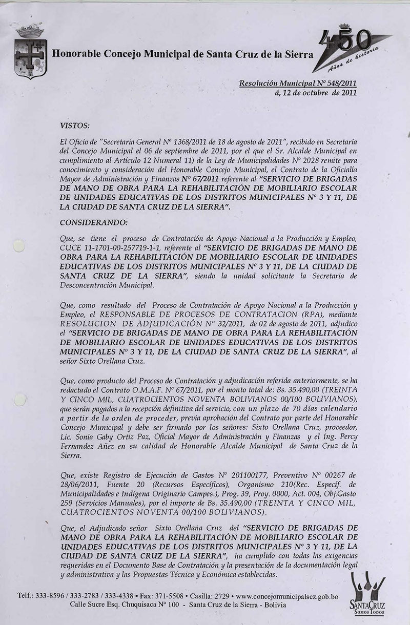 Aprueba el Contrato OMAF Nº 67/2011, para el “SERVICIO DE BRIGADAS DE MANO DE OBRA PARA LA REHABILITACIÓN DE MOBILIARIO ESCOLAR DE UNIDADES EDUCATIVAS DE LOS DISTRITOS MUNICIPALES Nº 3 Y 11 de la Ciudad de Santa Cruz de la Sierra.