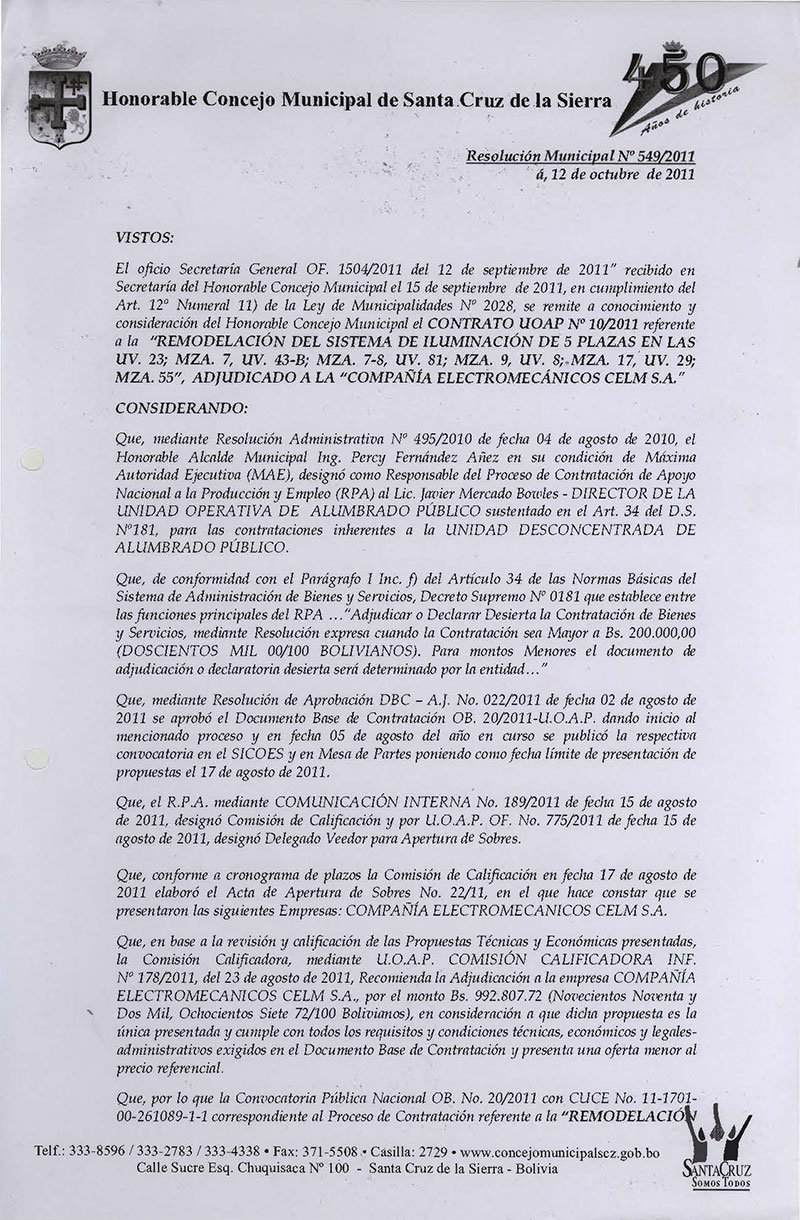 Aprueba el contrato UOAP Nº 10/2011, referente a la “REMODELACIÓN DEL SISTEMA DE ILUMINACIÓN DE 5 PLAZAS EN UV-23; MZ-7, UV-43B; MZ-7-8; UV-81; MZ-9, UV-8; MZ-17A, UV-29; MZ-55”, por el monto de Bs. 992.807,72.