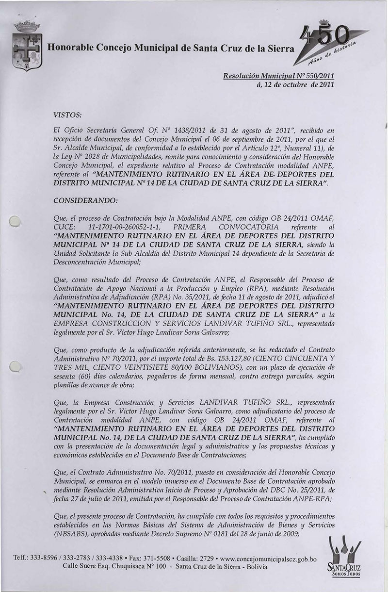 Aprueba el Contrato Administrativo N° 70/2011, referente al “MANTENIMIENTO RUTINARIO EN EL ÁREA DE DEPORTES DEL DISTRITO MUNICIPAL Nº 14, por Bs. 153.127,80. (CIENTO CINCUENTA Y TRES MIL, CIENTO VEINTISIETE 80/100 BOLIVIANOS). Adjudicado a la Empresa Construcción y Servicios LANDIVAR TUFIÑO SRL.