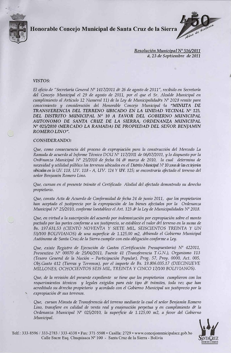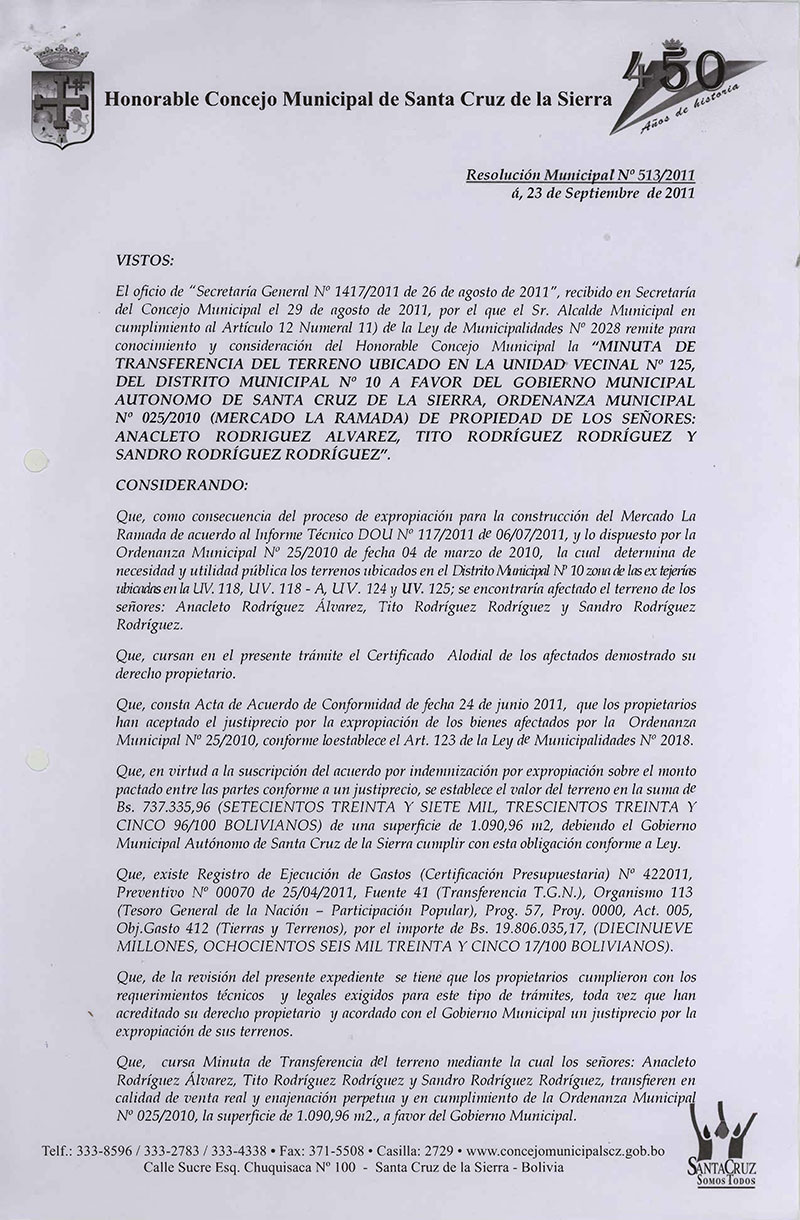 Aprueba la Minuta de Transferencia del Terreno Urbano con una superficie de 1.090,96 m2., emergente del Proceso de Expropiación según Ordenanza Municipal Nº 025/2010 (Mercado La Ramada U.V. 118), y pago del justiprecio a favor de los señores Anacleto Rodriguez Álvarez, Tito y Sandro Rodríguez Rodríguez.