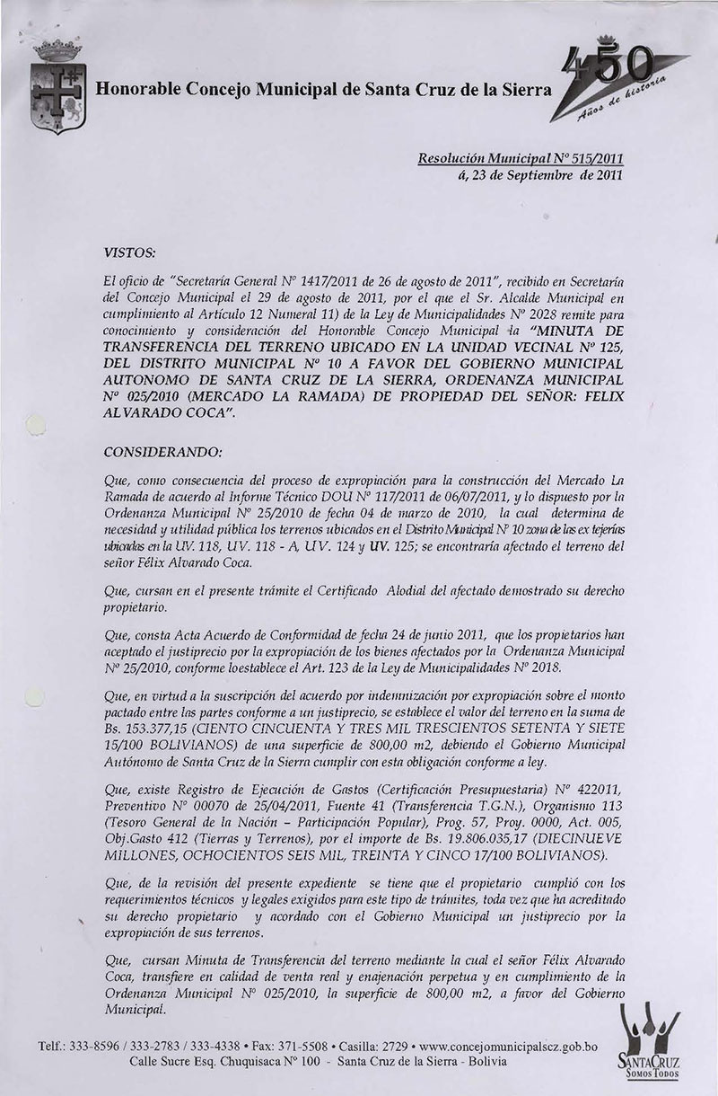 Aprueba la Minuta de transferencia de terreno urbano con una superficie de 800,00 m2, emergente del proceso de expropiación según Ordenanza Municipal Nº 025/2010 (Mercado La Ramada U.V. 118) y pago de justiprecio a favor del señor Félix Alvarado Coca.