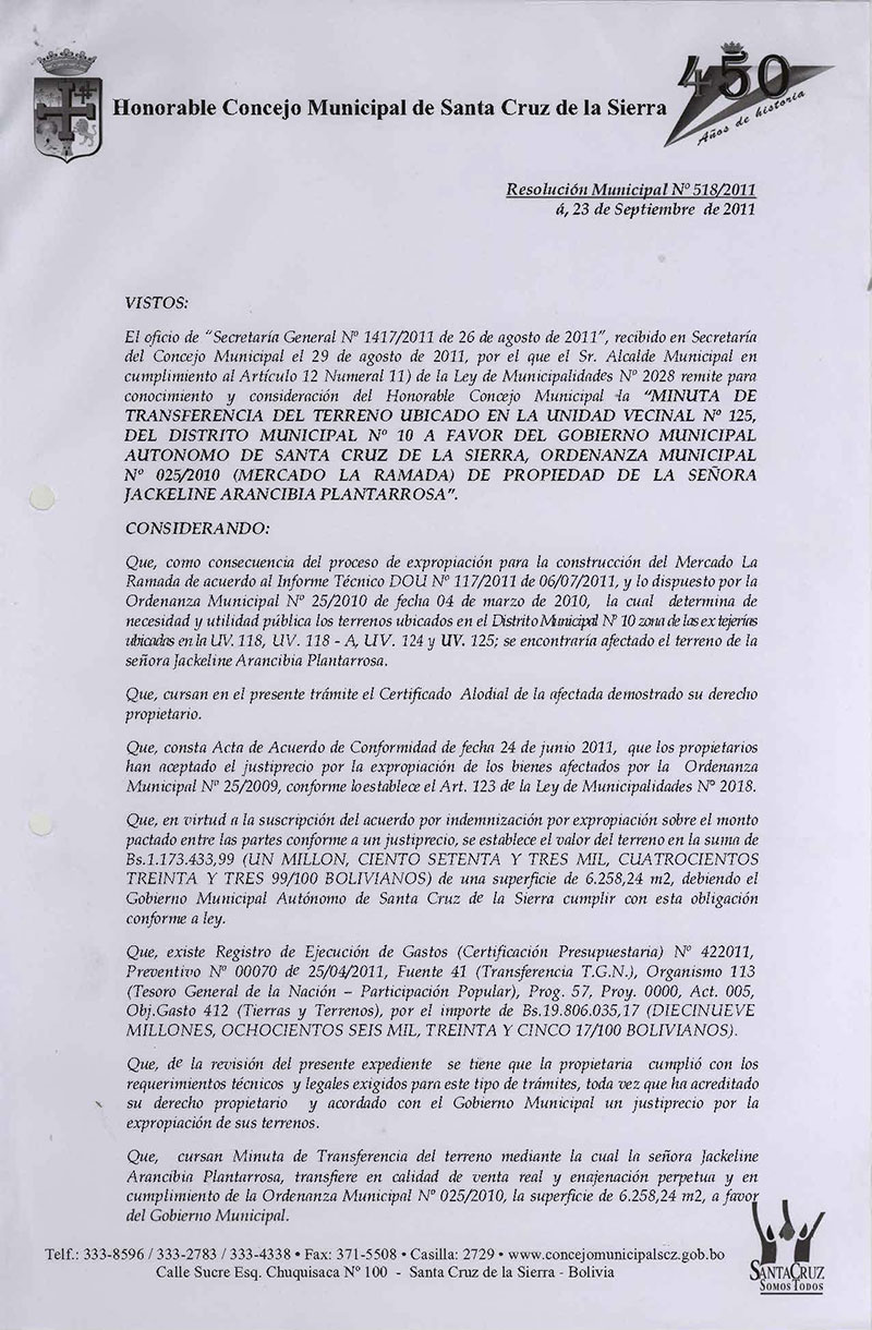 Aprueba la Minuta de Transferencia del Terreno Urbano con una superficie de 6.258,24 m2, emergente del Proceso de Expropiación según Ordenanza Municipal Nº 025/2010 (Mercado La Ramada U.V. 118) y pago de justiprecio a favor de la señora Jackeline Arancibia Plantarrosa.