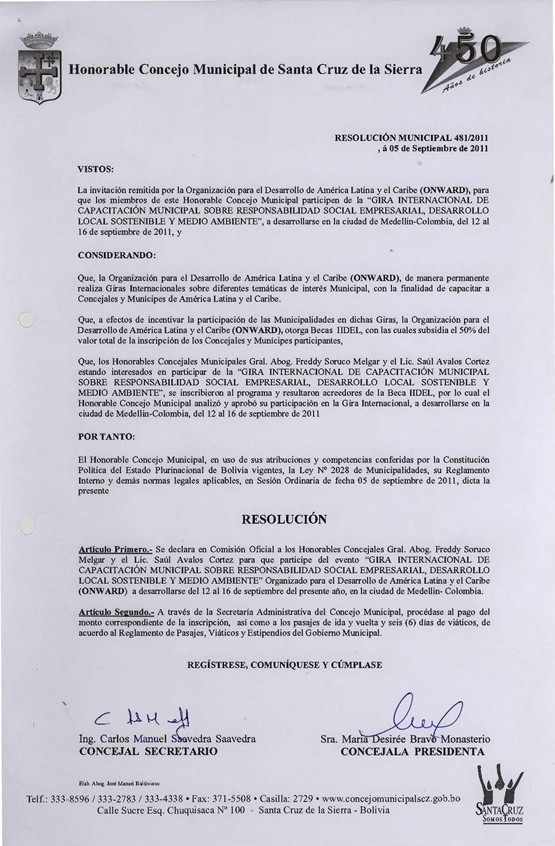 Declara en Comisión Oficial a los Concejales Gral. Abog. Freddy Soruco Melgar y el Lic. Saúl Avalos Cortez, para que participen del evento "GIRA INTERNACIONAL DE CAPACITACIÓN MUNICIPAL SOBRE RESPONSABILIDAD SOCIAL EMPRESARIAL, DESARROLLO LOCAL SOSTENIBLE Y MEDIO AMBIENTE.