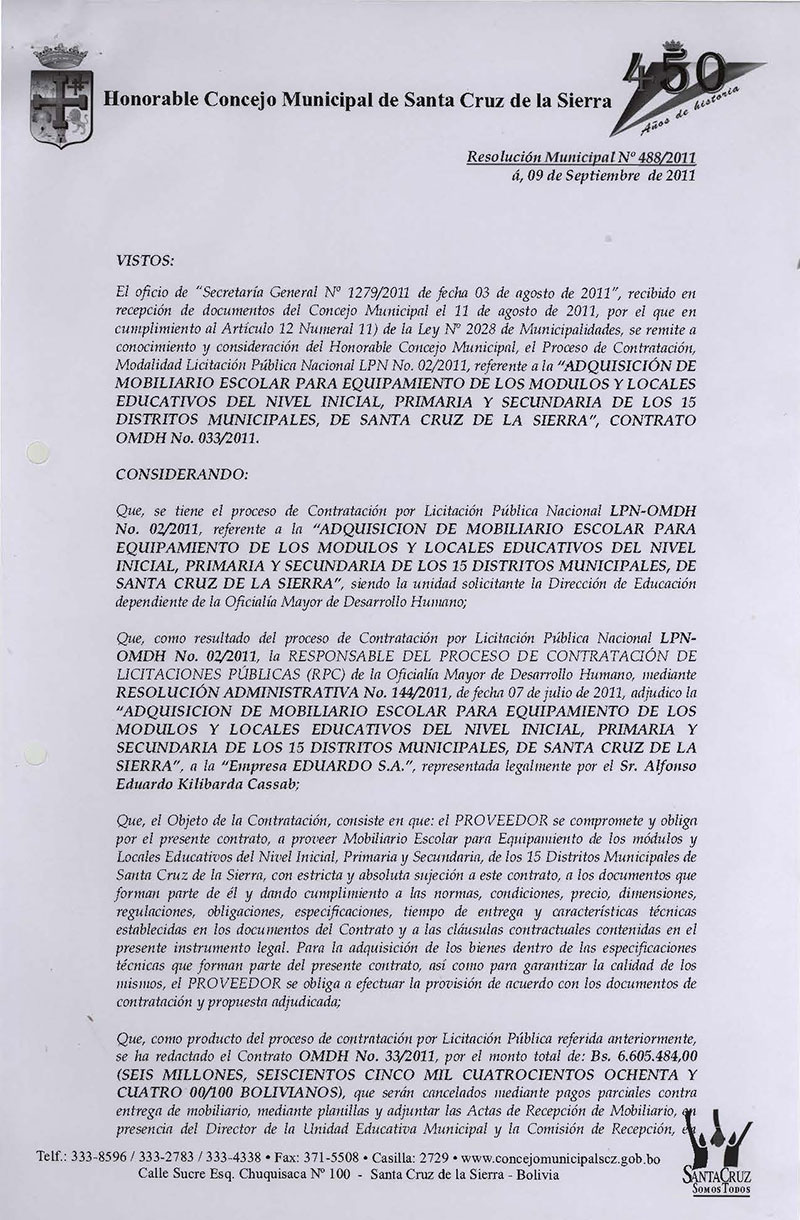 Aprueba el Contrato OMDH N° 33/2011, para la “ADQUISICIÓN DE MOBILIARIO ESCOLAR PARA EQUIPAMIENTO DE LOS MÓDULOS Y LOCALES EDUCATIVOS DEL NIVEL INICIAL, PRIMARIA Y SECUNDARIA DE LOS 15 DISTRITOS MUNICIPALES, por el monto de Bs. 6.605.484,00.