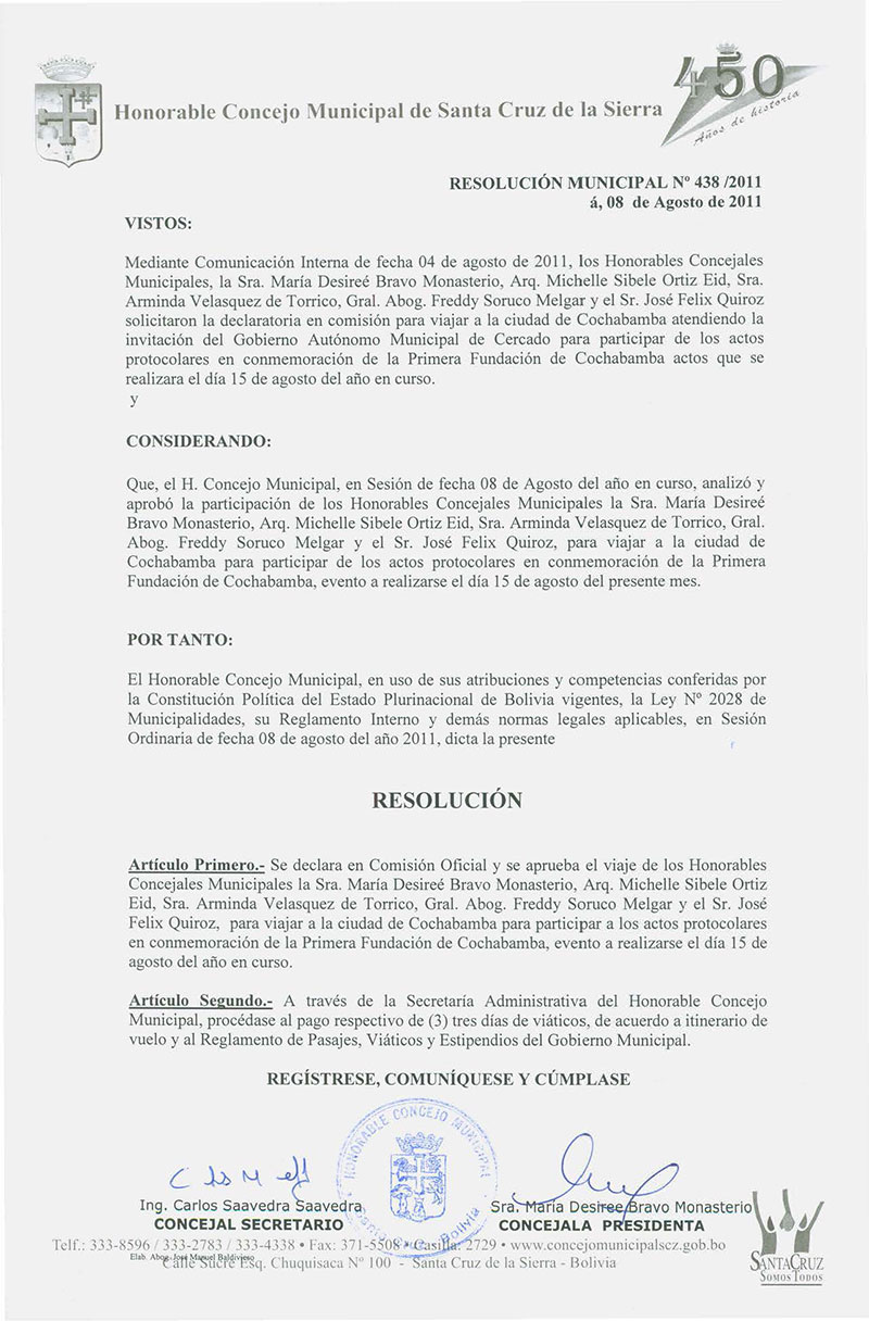 Declara en Comisión Oficial y aprueba viaje de los Concejales Sra. María Desireé Bravo Monasterio, Arq. Michele Sibele Ortíz, Sra. Arminda Velásquez de Torrico, Gral. Freddy Soruco y Sr. José Félix Quiroz, para viajar a la Ciudad de Cochabamba.