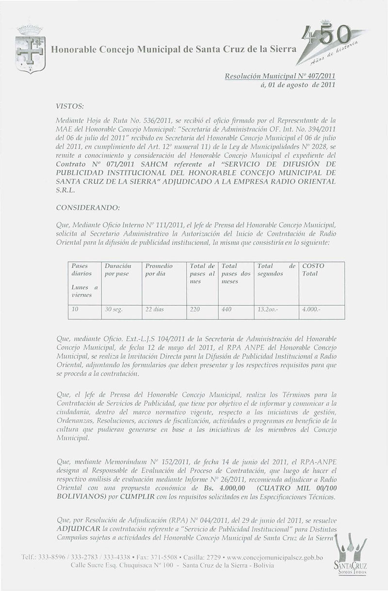 Aprueba el Contrato No. 71/2011 SAHCM, para la Contratación Directa del “SERVICIO DE DIFUSIÓN DE PUBLICIDAD INSTITUCIONAL DEL HONORABLE CONCEJO MUNICIPAL.”.
