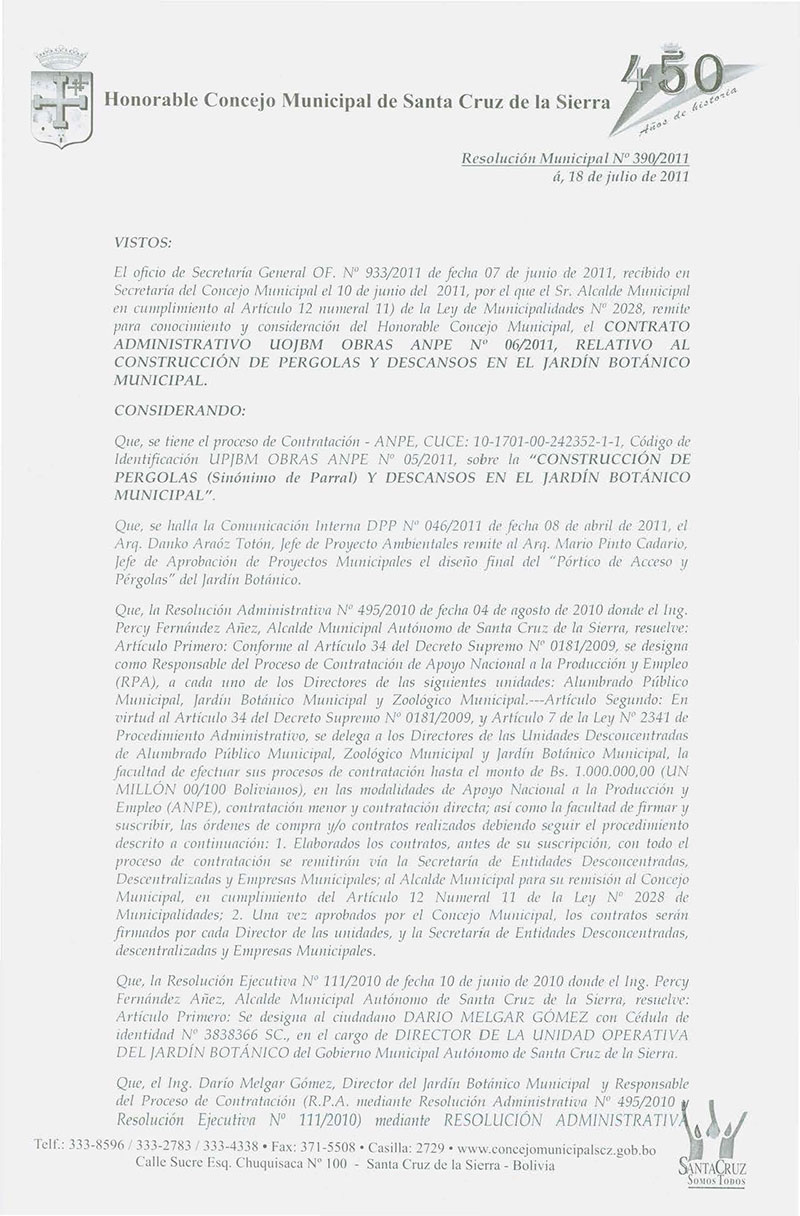 Aprueba el CONTRATO ADMINISTRATIVO UOJBM OBRAS ANPE Nº 06/2011, relativo a la “CONSTRUCCIÓN DE PERGOLAS Y DESCANSOS EN EL JARDÍN BOTÁNICO MUNICIPAL”.