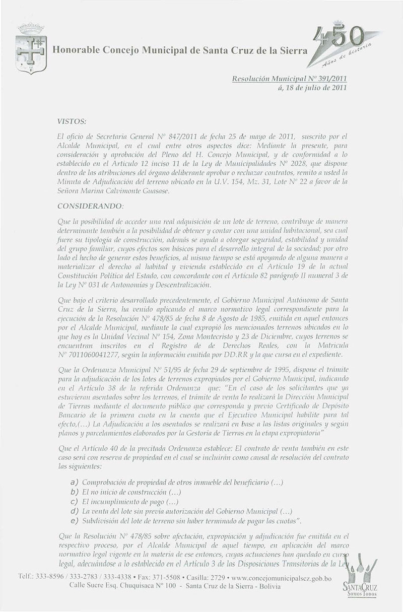 Aprueba la Minuta de Adjudicación Definitiva de un lote de terreno, ubicado en la Zona Este de esta ciudad, signado como lote Nº 22, Manzana 31, U.V. 154, a favor de MARINA CALVIMONTE GUASASE.