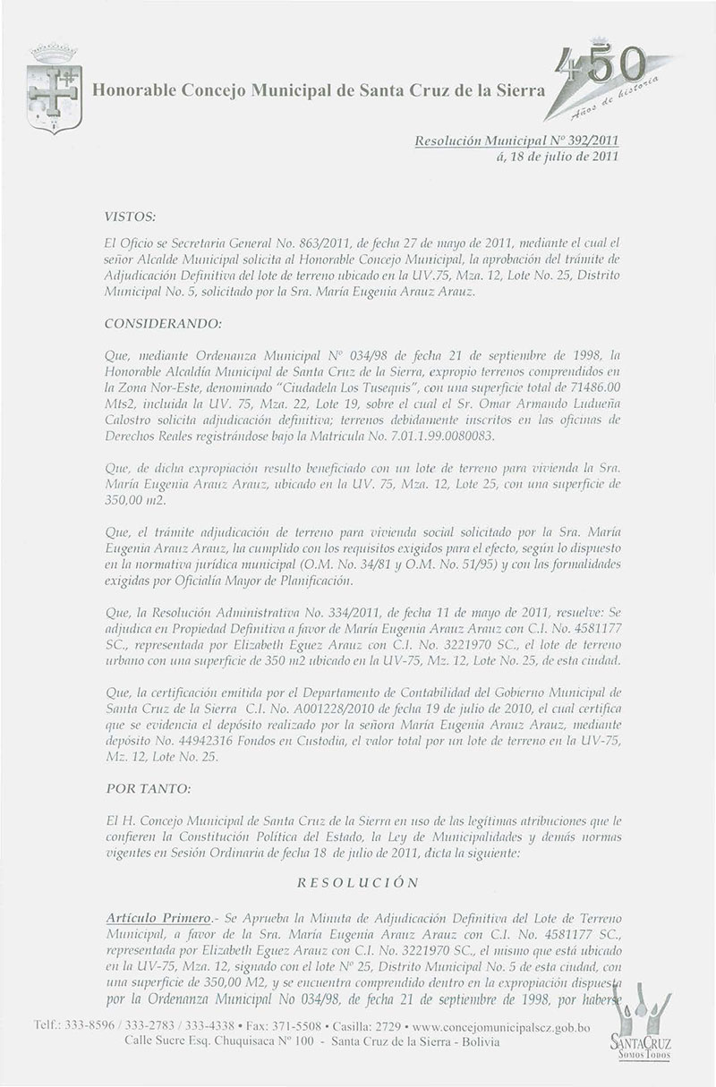 Aprueba la Minuta de Adjudicación Definitiva del Lote de Terreno a favor de la Sra. María Eugenia Arauz Arauz, que está ubicado en la UV-75, Mza. 12, signado con el lote Nº 25.