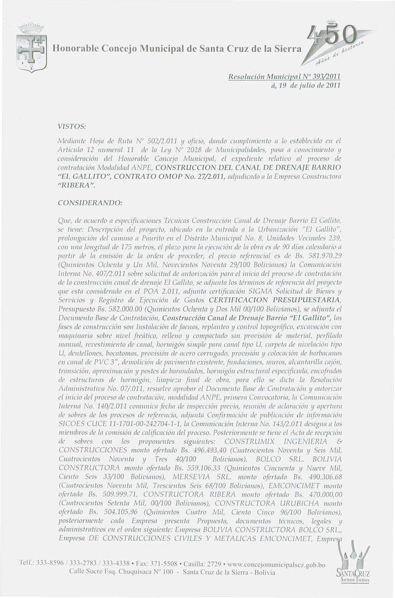 Aprueba el Contrato Administrativo, Modalidad ANPE No. 27/2011 OMOP, referente a la Construcción del Canal de Drenaje Barrio “EL GALLITO” Distrito Municipal No. 8.