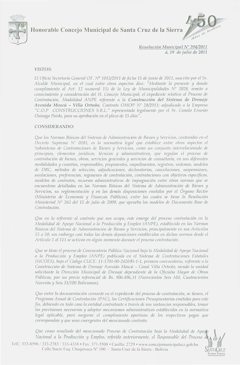 Aprueba el Contrato Administrativo OMOP N° 28/2011, relativo a la CONSTRUCCION DEL SISTEMA DE DRENAJE AV. MOSCU – VILLA ORTUÑO.