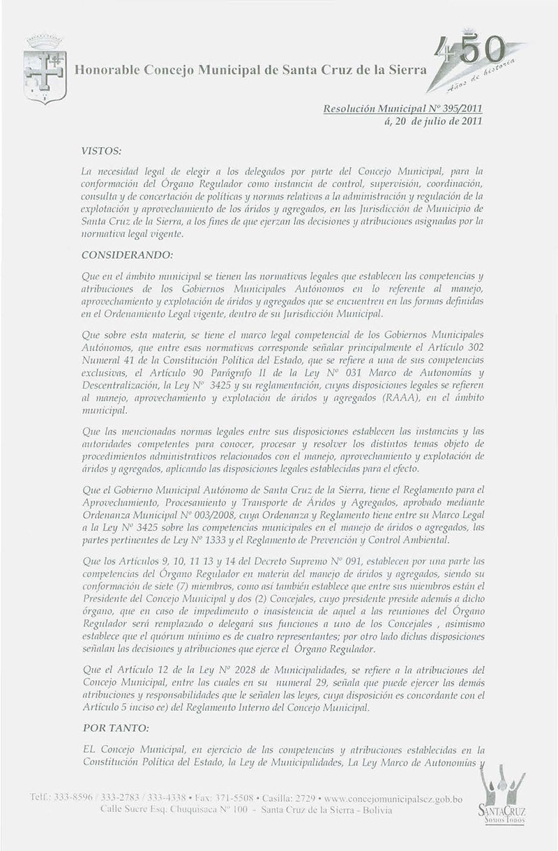 Designa a los Concejales: Sra. María Desirée Bravo Monasterio, Srta. Michelle Sibele Ortiz Eid y Lic. Leonardo Roca Egüez, como miembros del Órgano Regulador para el aprovechamiento y explotación de áridos y agregados existentes en la jurisdicción del municipio de Santa Cruz de la Sierra.