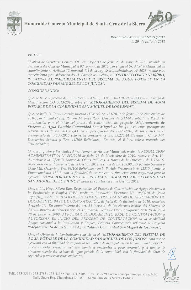 Aprueba el CONTRATO OMOP Nº 10/2011, relativo al “MEJORAMIENTO DEL SISTEMA DE AGUA POTABLE DE LA COMUNIDAD SAN MIGUEL DE LOS JUNOS”.