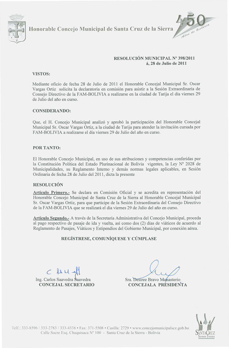 Declara en Comisión Oficial y se acredita en representación del Organo Deliberante al Concejal Municipal Sr. Oscar Vargas Ortiz, para que participe de la Sesión Extraordinaria del Consejo Directivo de la FAM-BOLIVIA.