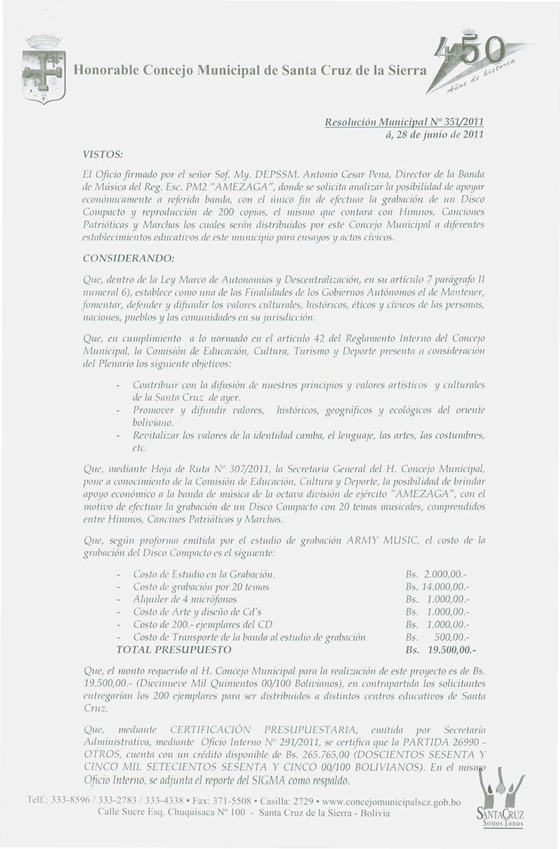 AUTORIZA, al Secretario de Administración del Concejo Municipal, proceder a la contratación para apoyar económicamente la grabación del Disco Compacto con 20 temas, de la banda de música AMEZAGA dependiente de la Octava División de Ejército.