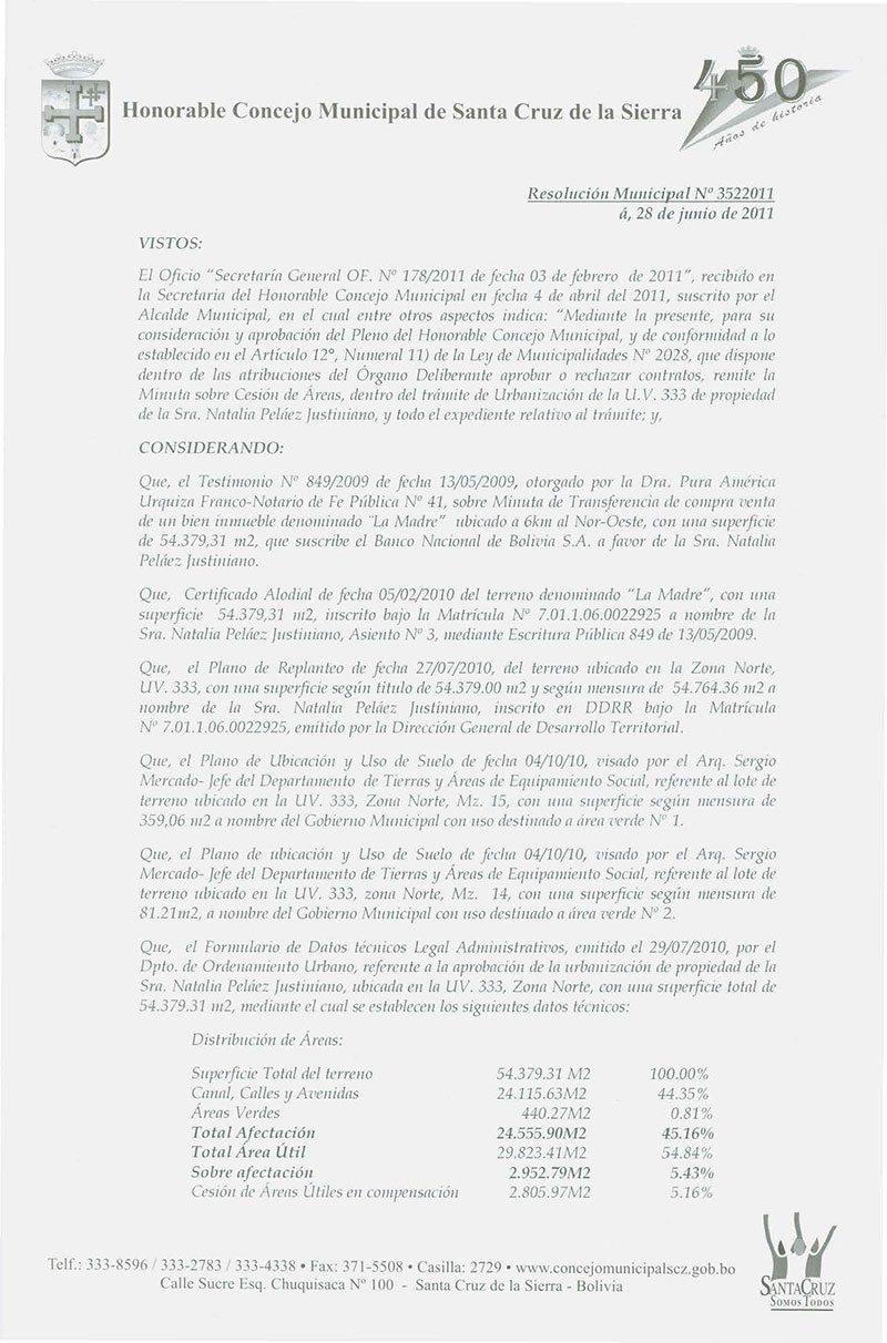 Aprueba el Contrato Nº 046/2011, referente al Uso de Superficie para mausoleo, que se adjudica a favor de la Señora Dominga Adela Valverde Castro, sobre un espacio de terreno para Mausoleo, ubicado en el Cementerio Municipal Sagrado Corazón de Jesús.