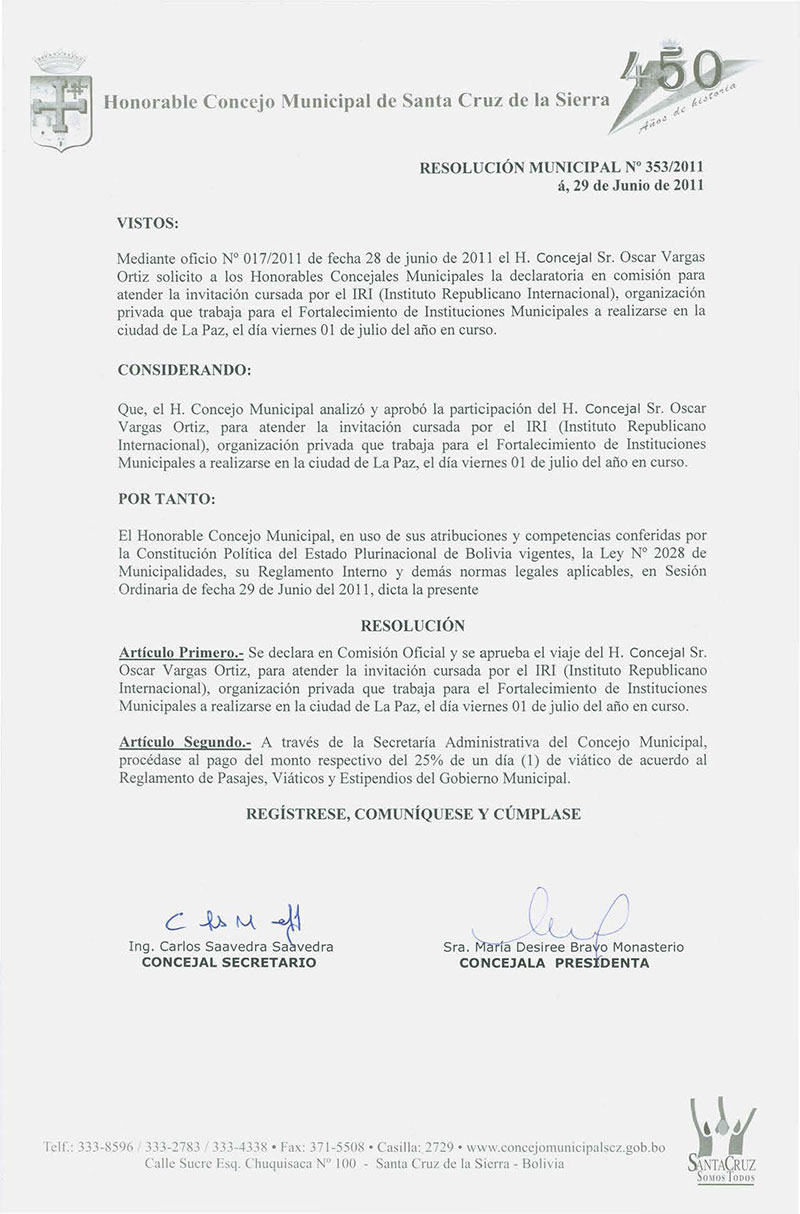 Declara en Comisión Oficial y se aprueba el viaje del Concejal Sr. Oscar Vargas Ortiz, para atender invitación cursada por el IRI (Instituto Republicano Internacional, Organización Privada que trabaja para el Fortalecimiento de Instituciones Municipales, a realizarse en la Ciudad de La Paz.