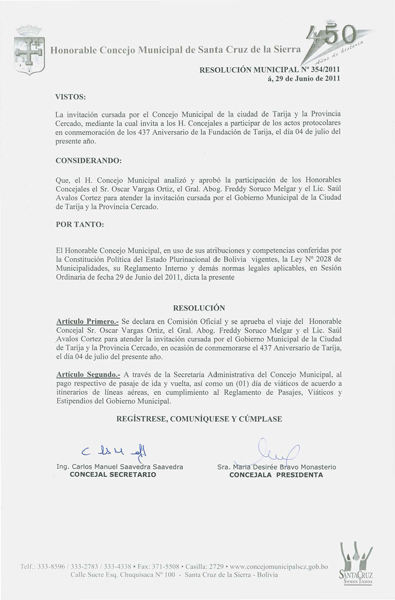 Declara en Comisión Oficial y se aprueba el viaje del Concejal Sr. Oscar Vargas Ortiz, el Gral. Abog. Freddy Soruco Melgar y el Lic. Saúl Avalos Cortez, para atender la invitación cursada por el Concejo Municipal de la Ciudad de Tarija y la Provincia Cercado.