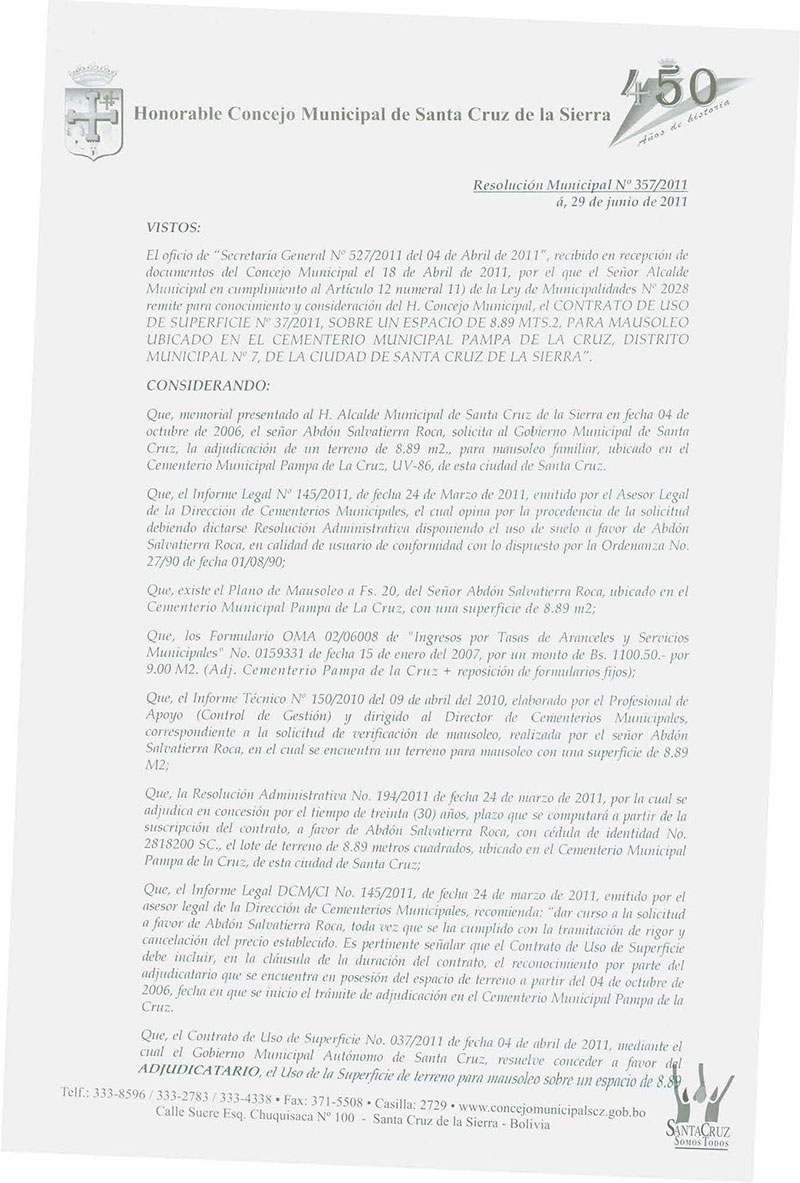 Aprueba el Contrato Nº 37/2011, referente al USO DE SUPERFICIE DE TERRENO, que se adjudica a favor del Sr. Abdón Salvatierra Roca, sobre un espacio para mausoleo ubicado en el Cementerio Municipal Pampa de la Cruz.