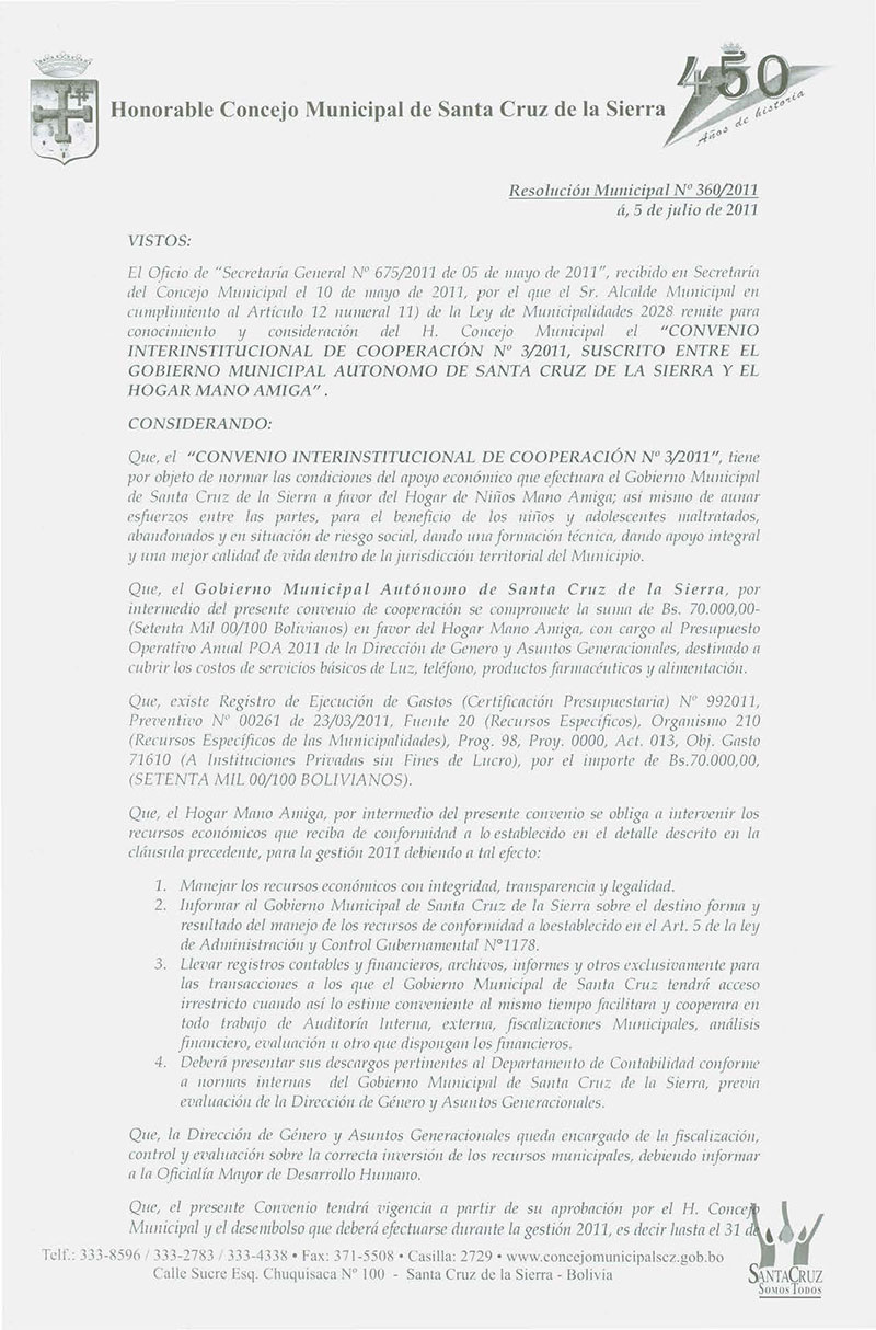Aprueba el “CONVENIO INTERINSTITUCIONAL DE COOPERACIÓN Nº 003/2011”, en favor del Hogar Mano Amiga.