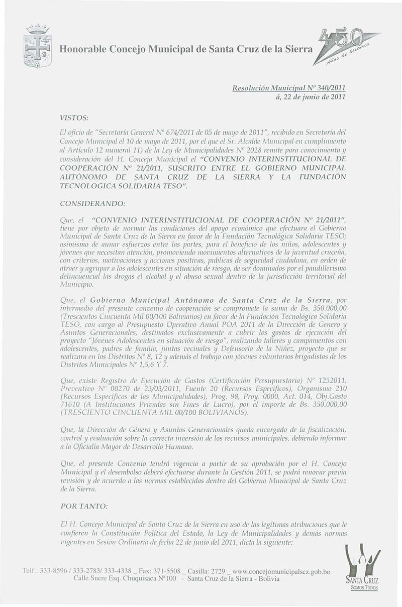 Aprueba el “CONVENIO INTERINSTITUCIONAL DE COOPERACIÓN Nº 021/2011”, en favor de la Fundación Tecnológica Solidaria TESO.