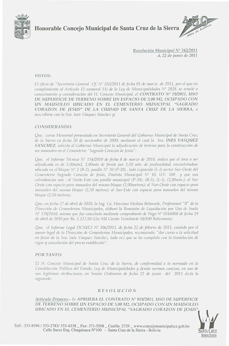 Aprueba el CONTRATO Nº 019/2011, USO DE SUPERFICIE DE TERRENO SOBRE UN ESPACIO OCUPADO CON UN MAUSOLEO UBICADO EN EL CEMENTERIO MUNICIPAL “SAGRADO CORAZON DE JESUS”, a favor de la Sra. Inés Vásquez Sánchez.