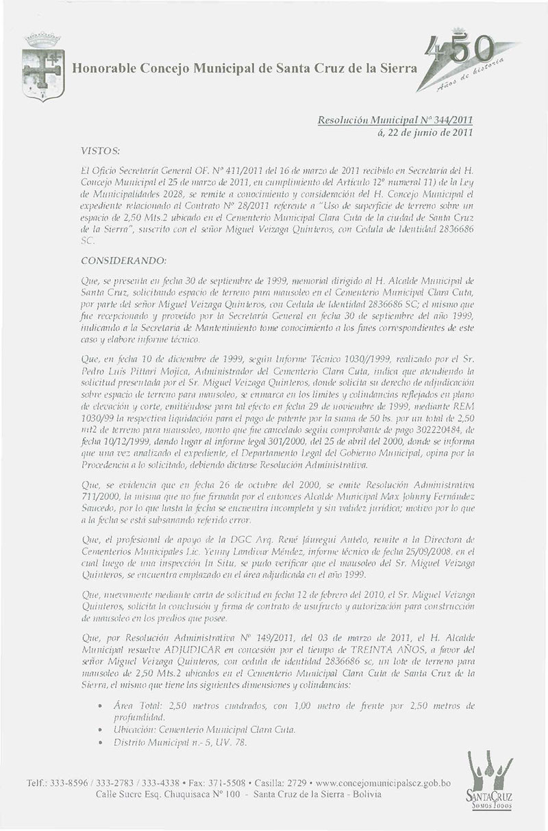 Aprueba el Contrato Nº 28/2011 referente al Uso de Superficie para mausoleo, que se adjudica a favor del Sr. Miguel Veizaga Quinteros, sobre un espacio de terreno para Mausoleo, ubicado en el Cementerio Municipal Clara Cuta.