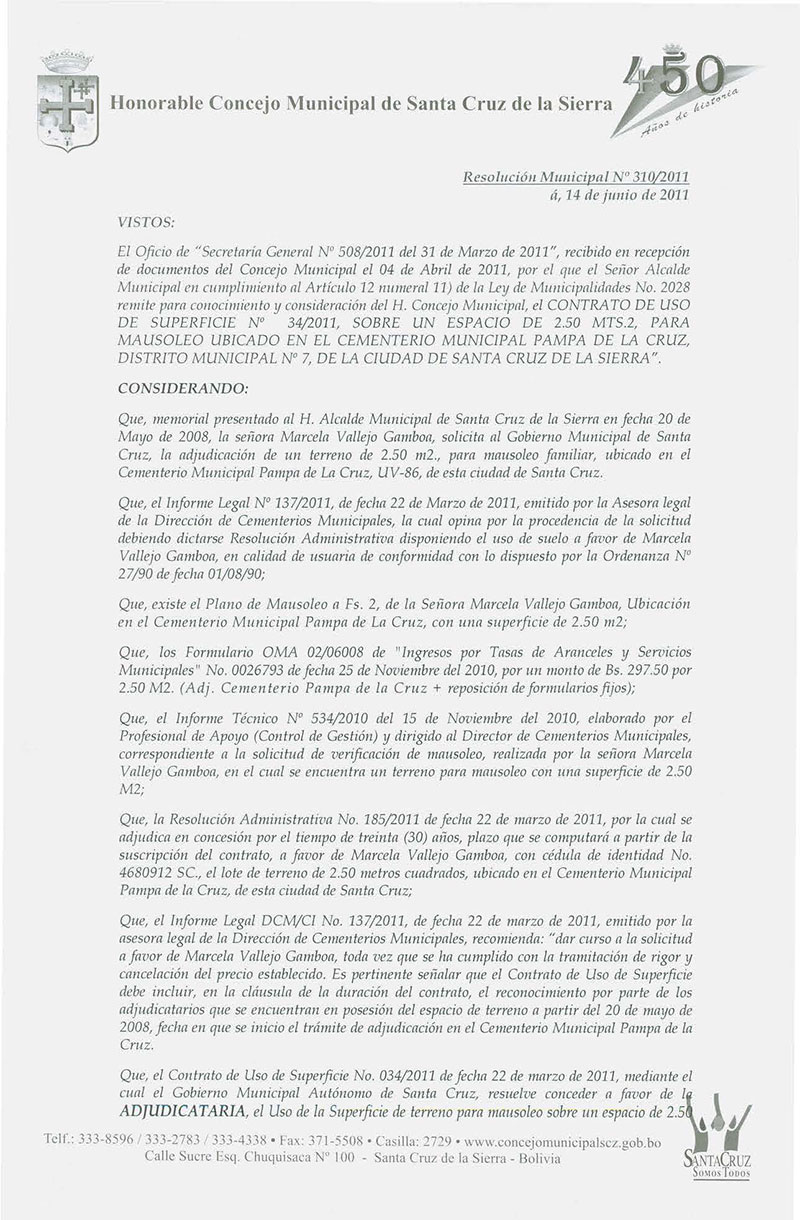 Aprueba el Contrato Nº 034/2011, referente al USO DE SUPERFICIE DE TERRENO, que se adjudica a favor de la Sra. Marcela Vallejo Gamboa, sobre un espacio para mausoleo ubicado en el Cementerio Municipal Pampa de la Cruz.