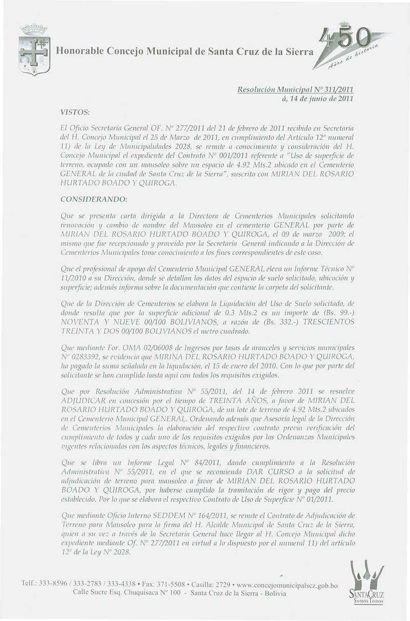 Aprueba el Contrato Nº 001/2011, referente al Uso de Superficie para mausoleo, que se adjudica a favor de la señora MIRIAN DEL ROSARIO HURTADO BOADO Y QUIROGA, sobre un espacio de terreno ubicado en el del Cementerio General.
