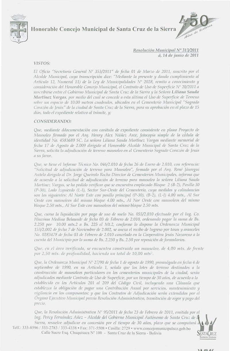 Aprueba el CONTRATO Nº 020/2011 SOBRE USO DE SUPERFICIE DE TERRENO, OCUPADO CON UN MAUSOLEO, UBICADO EN EL CEMENTERIO MUNICIPAL “SAGRADO CORAZON DE JESUS”, a favor de la Sra. Liliana Sauda Martínez Vargas.