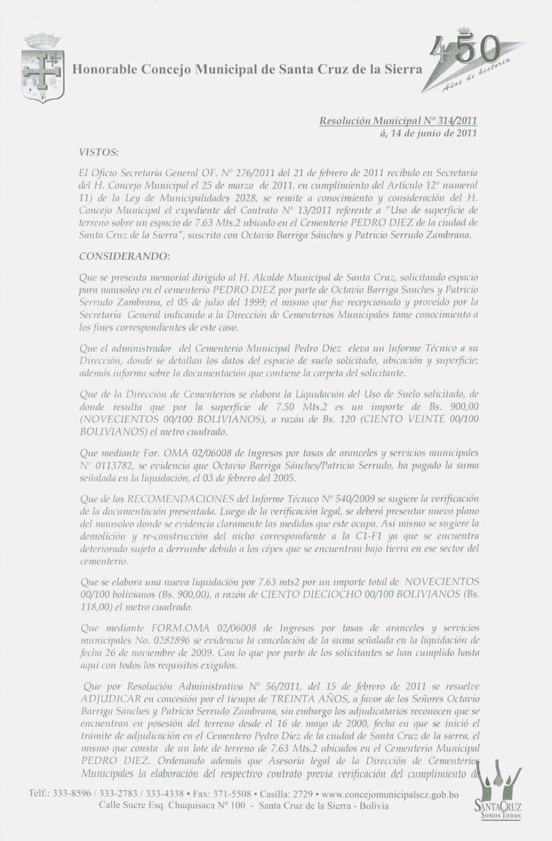 Aprueba el Contrato Nº 013/2011, referente al Uso de Superficie para mausoleo, que se adjudica a favor de los señores OCTAVIO BARRIGA SANCHES y PATRICIO SERRUDO ZAMBRANA, ubicado en el Cementerio Municipal PEDRO DIEZ.