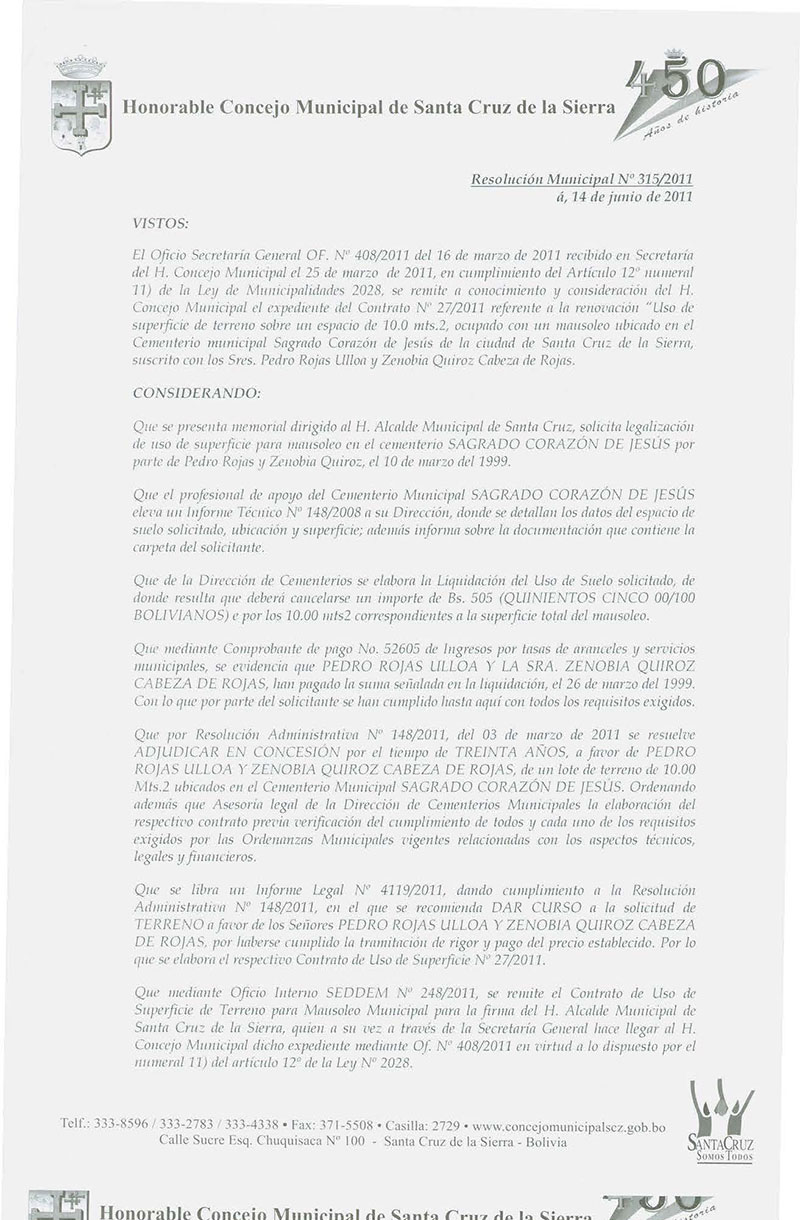 Aprueba el Contrato Nº 27/2011, referente al Uso de Superficie de Terreno ocupado con un Mausoleo ubicado en el Cementerio Municipal Sagrado Corazón de Jesús, a favor de la Señores Pedro Rojas Ulloa y Zenobia Quiroz Cabeza de Rojas.
