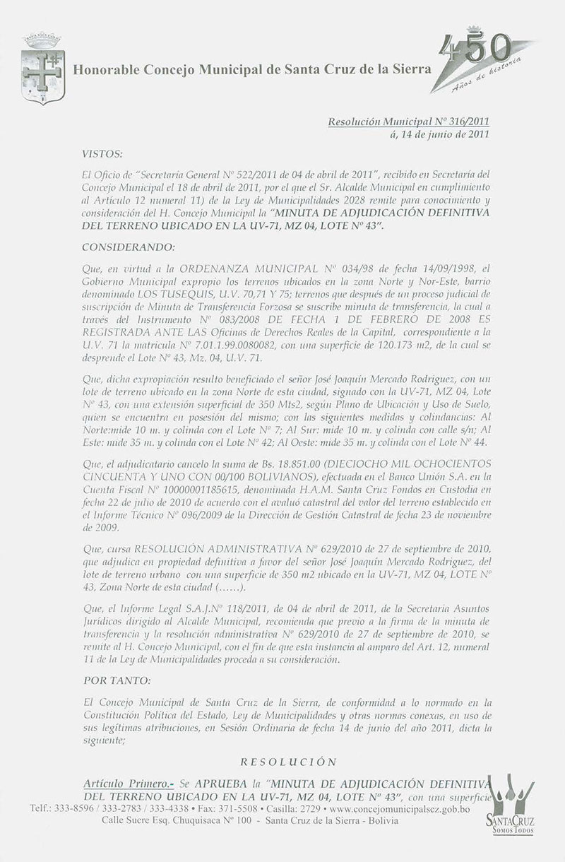 Aprueba la “MINUTA DE ADJUDICACIÓN DEFINITIVA DEL TERRENO UBICADO EN LA UV-71, MZ 04, LOTE Nº 43”, a favor del Sr. José Joaquin Mercado Rodríguez.