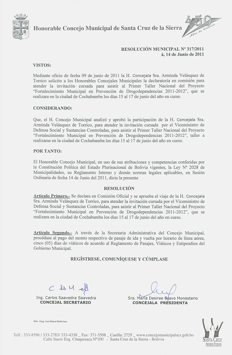 Declara en Comisión Oficial y se aprueba el viaje de la Concejala Sra. Arminda Velásquez de Torrico, para atender invitación cursada por el Viceministro de Defensa Social y Sustancias Controladas, para asistir al Primer Taller Nacional del Proyecto "Fortalecimiento Municipal en Prevención de Drogodependencias 2011-2012", que se realizara en la ciudad de Cochabamba.
