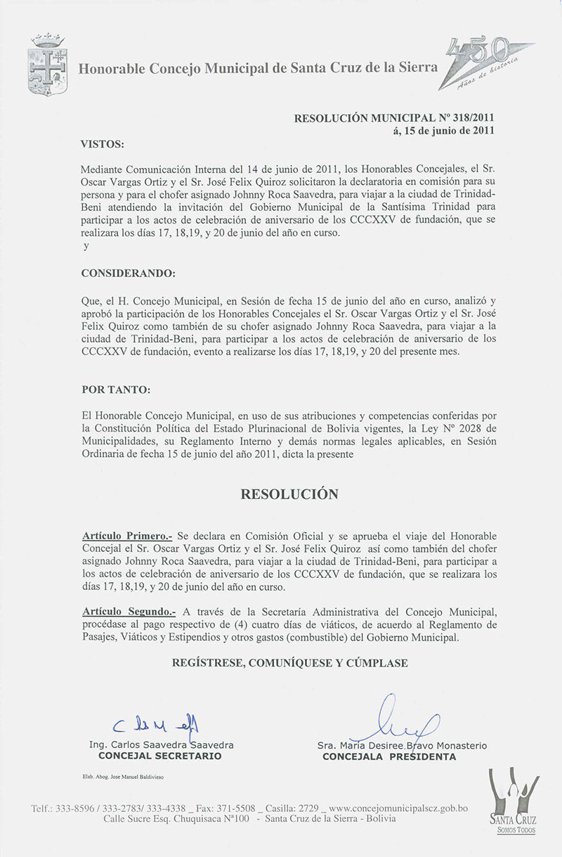 Declara en Comisión Oficial y se aprueba el viaje del Concejal el Sr. Oscar Vargas Ortiz y el Sr. José Félix Quiroz así como también del chofer asignado Johnny Roca Saavedra, para viajar a la ciudad de Trinidad-Beni.