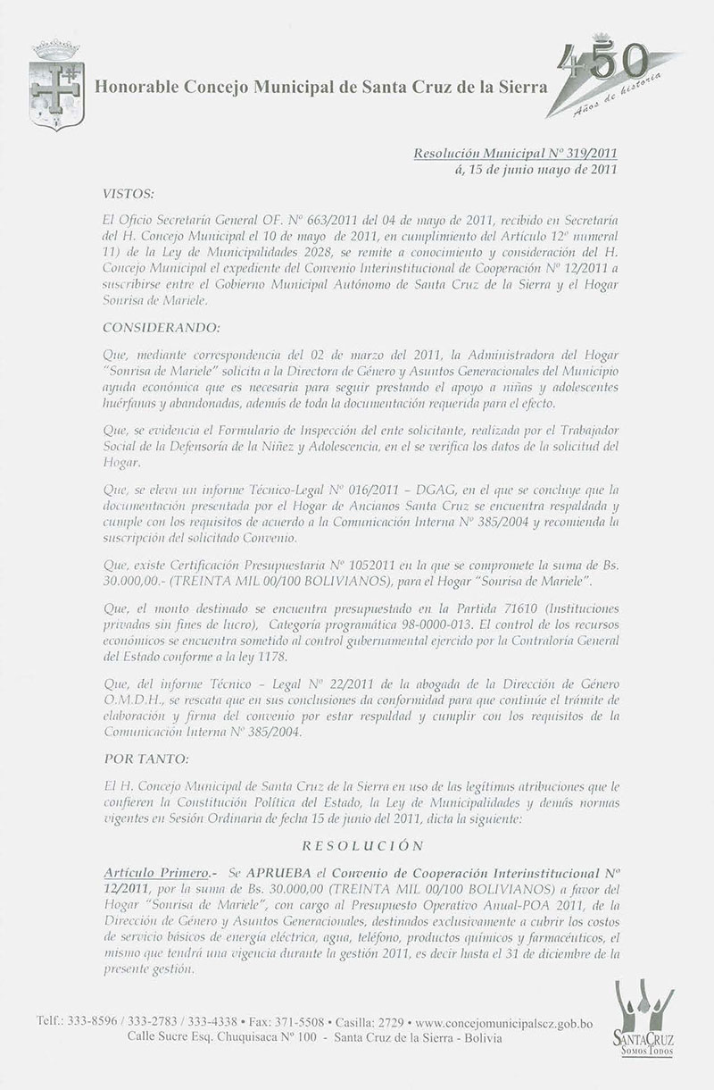 Aprueba el Convenio de Cooperación Interinstitucional Nº 12/2011, suscrito con el Hogar “Sonrisa de Mariele”.