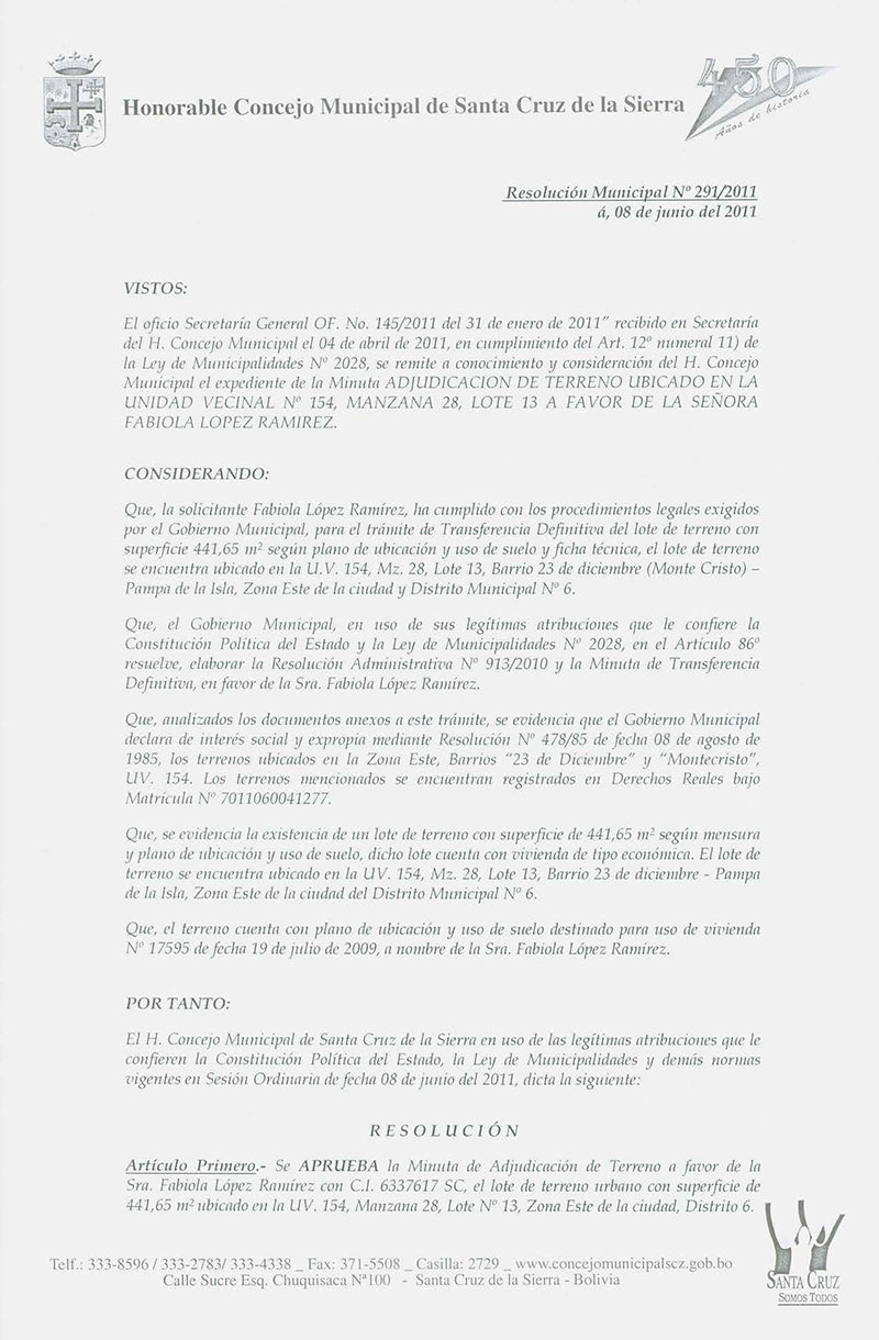 Aprueba la Minuta de Adjudicación de Terreno a favor de la Sra. Fabiola López Ramírez el lote de terreno urbano con superficie de 441,65 m2ubicado en la UV. 154, Manzana 28, Lote Nº 13, Zona Este de la ciudad, Distrito 6.