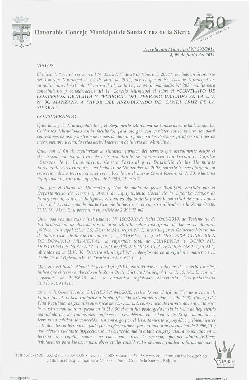 Aprueba el Contrato de Concesión Gratuita y temporal a favor del Arzobispado de Santa Cruz, terreno de propiedad municipal ubicado en la U.V. 30, donde se encuentra construido la Capilla “Siervas de la Encarnación, Centro Pastoral y el Domicilio de las Hermanas Siervas de Encarnación”.