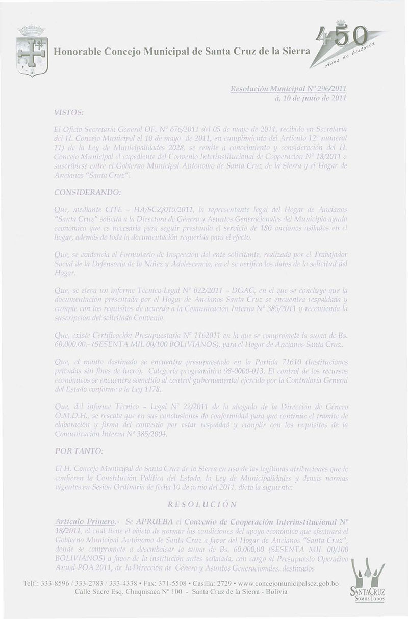 Aprueba el Convenio de Cooperación Interinstitucional Nº 18/2011, de apoyo económico que efectuara el Gobierno Municipal Autónomo de Santa Cruz de la Sierra a favor del Hogar de Ancianos “Santa Cruz”.