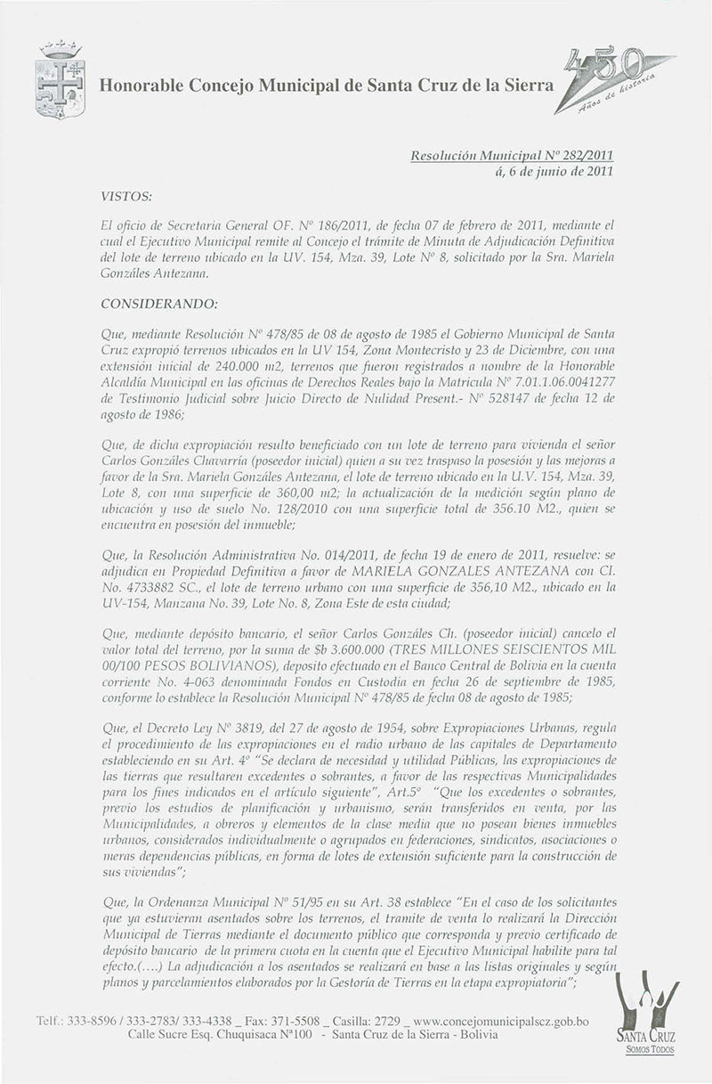 Aprueba la Minuta de Adjudicación Definitiva de Terreno, a favor de la Sra. Mariela González Antezana, del lote de terreno ubicado en la UV-154, Mza. 39, lote Nº 8.