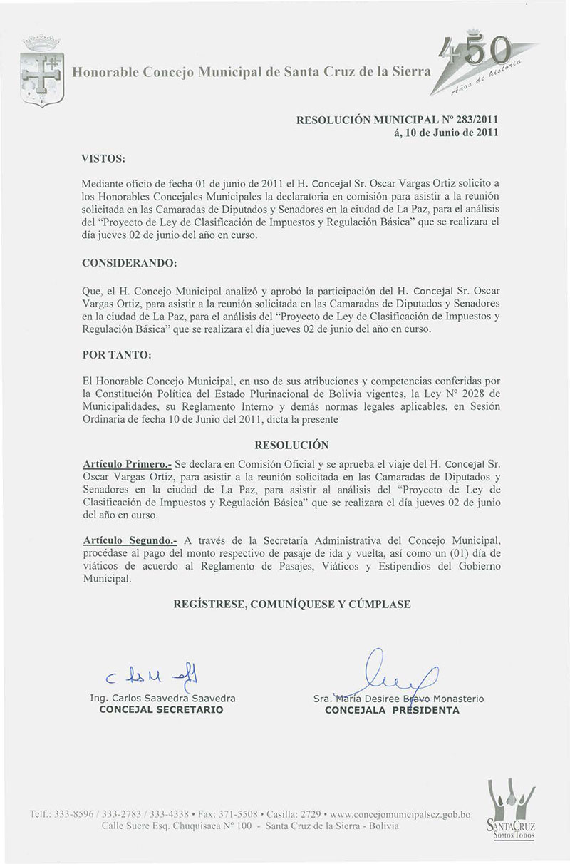 Declara en Comisión Oficial y se aprueba el viaje del Concejal Sr. Oscar Vargas Ortiz, para asistir a la reunión solicitada en las Cámaras de Diputados y Senadores en la ciudad de La Paz, para asistir al análisis del "Proyecto de Ley de Clasificación de Impuestos y Regulación Básica".