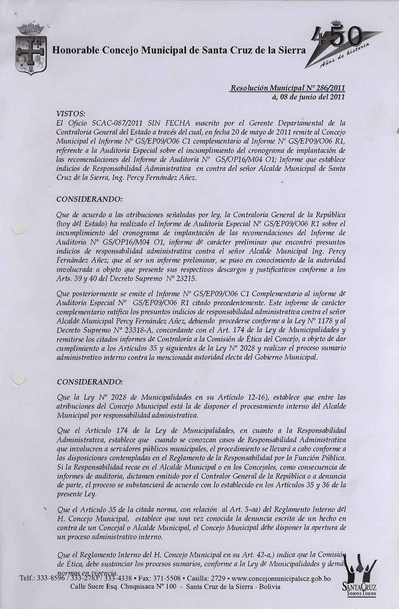Dispone la Apertura de un Proceso Administrativo Interno en contra del señor Alcalde de la ciudad de Santa Cruz, Ing. Percy Fernández Añez, a ser sustanciado por la vía sumaria por la Comisión de Ética del Concejo Municipal.