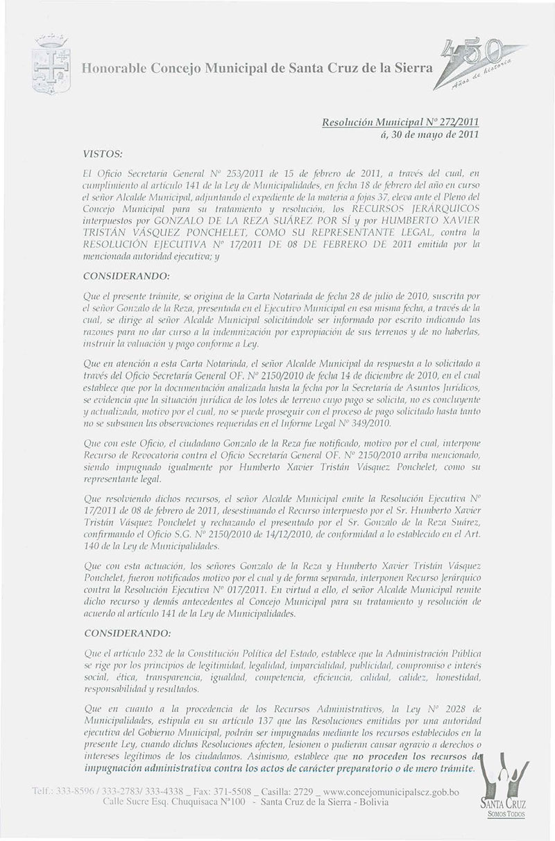 Declara IMPROCEDENTES los Recursos Jerárquicos interpuestos por los ciudadanos Gonzalo de la Reza Suárez y Humberto Xavier Tristán Vásquez Ponchelet y por consiguiente, se CONFIRMA la Resolución Ejecutiva Nº 17/2011 emitida por el señor Alcalde Municipal.