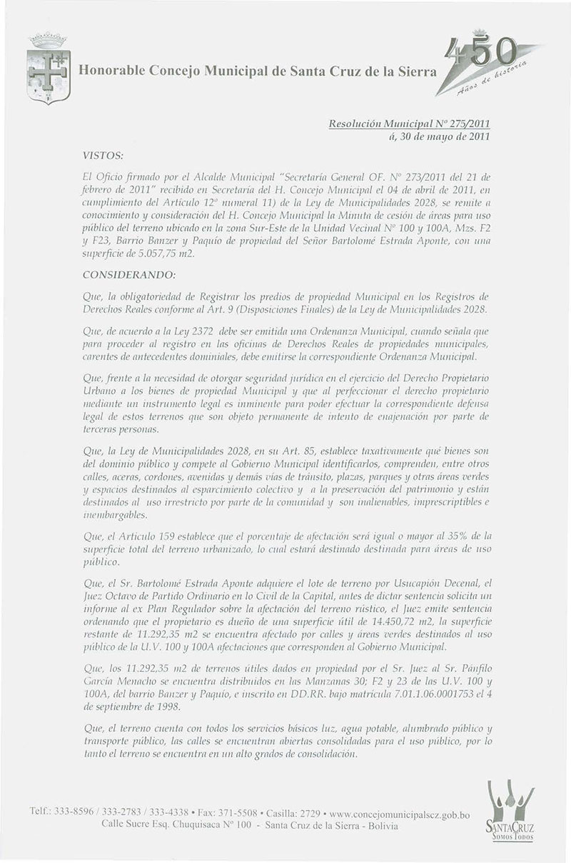 Declara como bien de dominio público y de propiedad municipal, como producto del proceso de Reestructuración correspondiente al Barrio “Banzer y Paquío” ubicado en la zona Sureste, U.V. 100 y 100A, Distrito Municipal Nº 7.